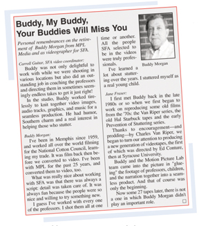 Following Buddy Morgan’s retirement, a tribute to his career ran in the Fall 2004 newsletter. At the time, Buddy said, “What was really nice about working with SFA was that there was always a script. Details were taken care of. It was fun because people were so nice and willing to try something new... I’ve learned a lot about stuttering over the years. I stuttered myself as a real young child.”