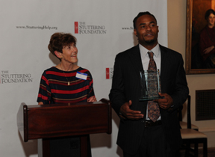 New York (May 8, 2012) — NFL Cornerback Ellis Lankster, of the New York Jets, was honored by the Stuttering Foundation at a May 8th gala in New York to celebrate National Stuttering Awareness Week and the Foundation’s 65th Anniversary as the world’s leading charitable organization helping those who stutter.