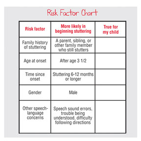 For free information on stuttering and detailed explanation of each risk factor, contact the Stuttering Foundation at 800-992-9392 or ASHA at 800-638-Talk (8255). You may also visit www.stutteringhelp.org or www.asha.org.