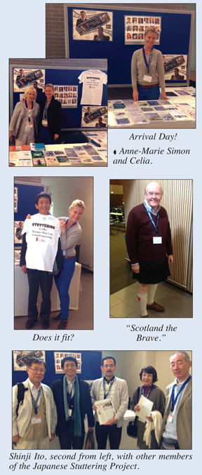 A. My most interesting experience was in the very first hour I got there. I was scrambling to get the booth up as quickly as possible, and before a speech was finishing in a room right next to me. I wanted to get a picture on Facebook quickly! I had just finished when out poured all these people from the speech room. Five enthusiastic people from Japan, one of them Shinji Ito, executive director of the Japan Stuttering Project, came straight to me with interest in the booth and admiration toward my grandfather, Malcolm Fraser. I took some pictures with them and put the pictures up on Facebook! I had just arrived, and right then and there, felt welcomed and thought surely our booth will be useful to others as well.