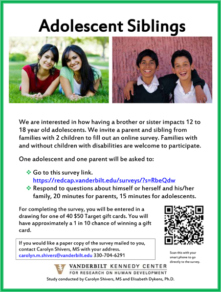Participant Criteria: Families with 2 children, both children must be between the ages of 12 and 18Description: We are interested in how having a brother or sister impacts adolescents. We invite parents and siblings to fill out an online survey. Families with and without children with disabilities are welcome to participate.